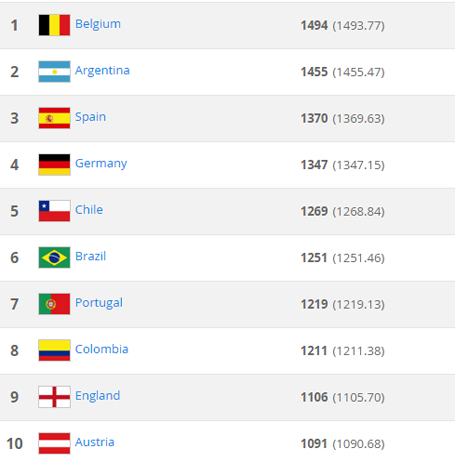 Các vị trí còn lại trong top 10 thế giới lần lượt thuộc về các đội tuyển Tây Ban Nha, Đức, Chile, Brazil, Bồ Đào Nha, Colombia, Anh và Áo.