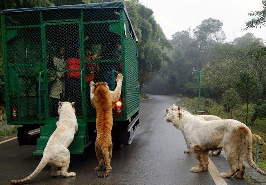 Vietbf.com - Du khách ưa mạo hiểm tại thành phố Trùng Khánh, Trung Quốc đã bị đàn sư tử và hổ bao vây, vì cánh cửa lưới sắt có gắn miếng thịt sống nên dể dàng dụ các con hổ và sư tử tới để nhóm du khách này tham quan.