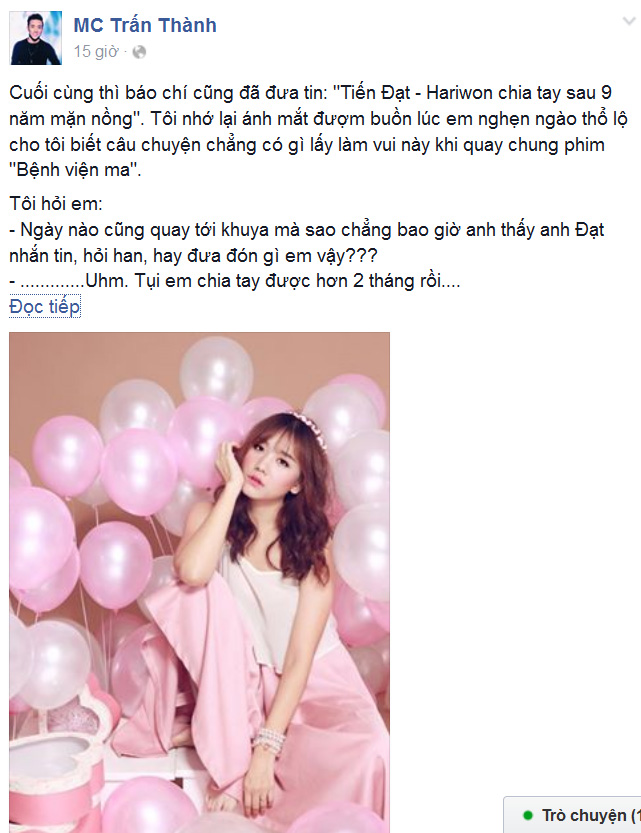 Bất ngờ bị lôi vào cuộc khi bị cho là 'người thứ 3' xen vào mối quan hệ giữa Hari Won và Tiến Đạt, tối 18/1, MC Trấn Thành đã lên trang cá nhân viết 1 status khá dài để bênh vực cho Hari Won. Trong đó có đoạn: