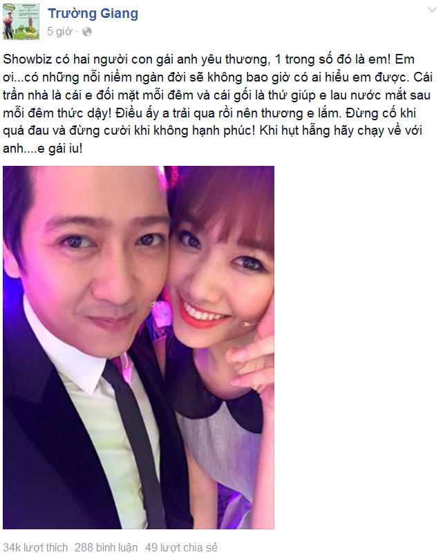 Sáng sớm 19/1, danh hài Trường Giang cũng đăng 1 bức ảnh tình tứ giữa anh và Hari Won kèm dòng trạng thái rất thân thiết: "Showbiz có hai người con gái anh yêu thương, 1 trong số đó là em! Em ơi...có những nỗi niềm ngàn đời sẽ không bao giờ có ai hiểu em được. Cái trần nhà là cái e đối mặt mỗi đêm và cái gối là thứ giúp e lau nước mắt sau mỗi đêm thức dậy! Điều ấy a trải qua rồi nên thương e lắm. Đừng cố khi quá đau và đừng cười khi không hạnh phúc! Khi hụt hẫng hãy chạy về với anh....e gái iu!".