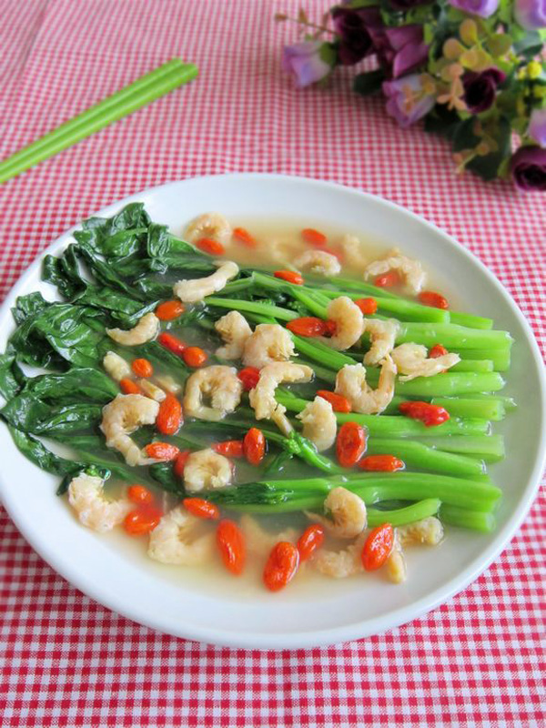 Cho nước vào nồi cùng với tôm, kỷ tử, một ít muối, dầu ăn, gừng đun sôi trong khoảng 2 phút. Tiếp theo, cho cải ngọt vào đun sôi chín cải thì vớt cải ra đĩa.