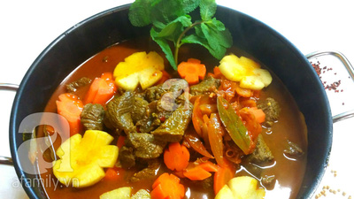 Bò kho nóng hổi ăn cùng với bánh mì hay bún kèm rau quế, ngò gai, chanh, ớt rất ngon. Đây là một trong những "món tủ" của mình, mình thường xuyên làm nó cho gia đình cũng như đãi khách, đãi bạn, ai ăn cũng đều tấm tắc khen ngon. Bạn hãy cùng thử nhé!