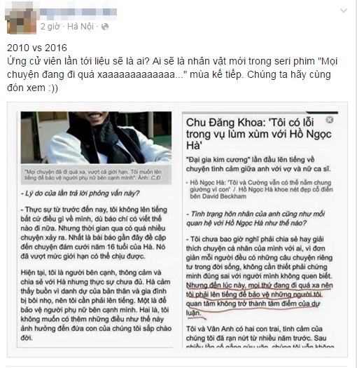 “Với Hà, tôi muốn nói lời xin lỗi. Tôi cảm ơn Hà vì đã im lặng chịu nhiều điều tiếng không xác thực. Mong dư luận hãy cho chúng tôi tự giải quyết câu chuyện của mình” – Chu Đăng Khoa chia sẻ.