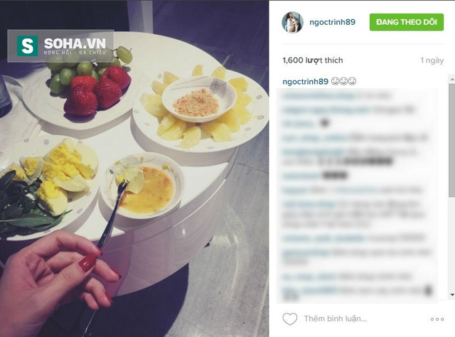 Thực đơn của Ngọc Trinh vào đêm khuya bao gồm dâu, nho, bưởi và trứng. Trong phần comment chia sẻ với độc giả, Ngọc Trinh cũng hồ hở khoe rằng mình ăn trứng ngỗng.Cô nàng còn vui vẻ khoe rằng: "Trứng ngỗng rất béo nhưng em không quan tâm ăn nó có mập hay không vì em ăn gì cũng vậy à. Thích ăn gì là em ăn đó, không quan tâm nó có mập hay không?