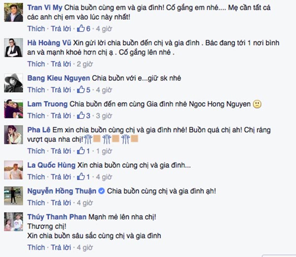 Ngoài Đàm Vĩnh Hưng, trên mạng xã hội, đạo diễn Trần Vi Mỹ, ca sĩ Bằng Kiều, Lam Trường, Pha Lê, nhạc sĩ Nguyễn Hồng Thuận, diễn viên La Quốc Cùng… cũng gửi lời đồng viên, chia buồn sâu sắc nhất đến gia đình Hồng Ngọc.