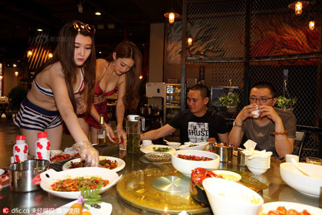 Để thu hút thực khách và gây được ấn tượng mới mẻ, độc đáo, một nhà hàng ở thành phố Thẩm Dương, tỉnh Liêu Ninh, đã mạnh dạn chi tiền thuê một dàn mỹ nữ trẻ làm phục vụ. Dàn phục vụ viên toàn các cô gái trẻ đẹp, vóc dáng cao ráo, đặc biệt khoe thân nóng bỏng trong trang phục bikini nhiều màu sắc.