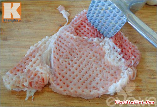 Bước 2: Thịt heo rửa sạch, dùng chày đập hai bên cho thịt mềm. Cho thịt vào âu, ướp cùng với gia vị phía trên cùng với tỏi, hành… xay. Để ít nhất 2 tiếng hay qua đêm cho thịt ngấm.