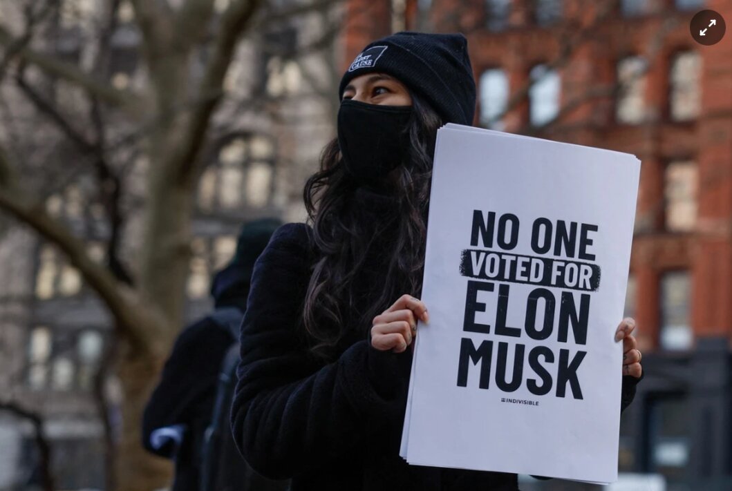 Một người biểu tình tại New York mang theo biểu ngữ "Không ai bầu cho Elon Musk", ngày 5/2. Ảnh: Reuters.
