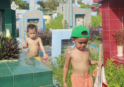Trẻ em đá bóng ở những khoảng trống của nghĩa địa. Các em nhỏ hơn thì vui chơi, vô tư chạy nhảy như không có sự hiện diện các ngôi mộ.