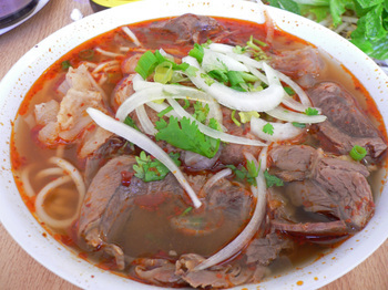 Nồi bún bò đã xong. Bún bò ăn nóng và cay mới ngon. Phần đông dân Huế ăn bún với ớt xanh nguyên trái cắn nghe cái bụp mới đã! Ăn với rau ghém sống, có người muốn ăn rau trụng thì trụng với nước thật sôi trước khi ăn chứ không trụng để sẵn ( cần có một cái vợt để trụng rau và bún tươi ).