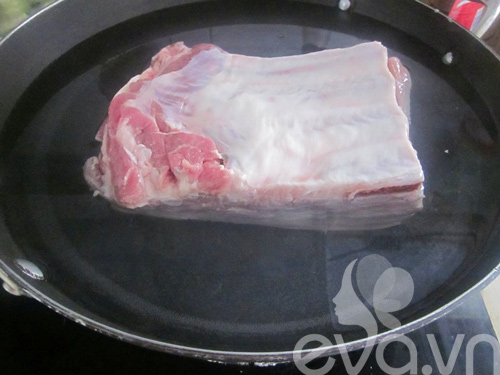 Bước 1: Thịt rửa sạch, cạo hết lông trên bì. Nấu 1 nồi nước sôi, cho thịt vào luộc 7 phút, sau đó vớt ra thái miếng vuông.