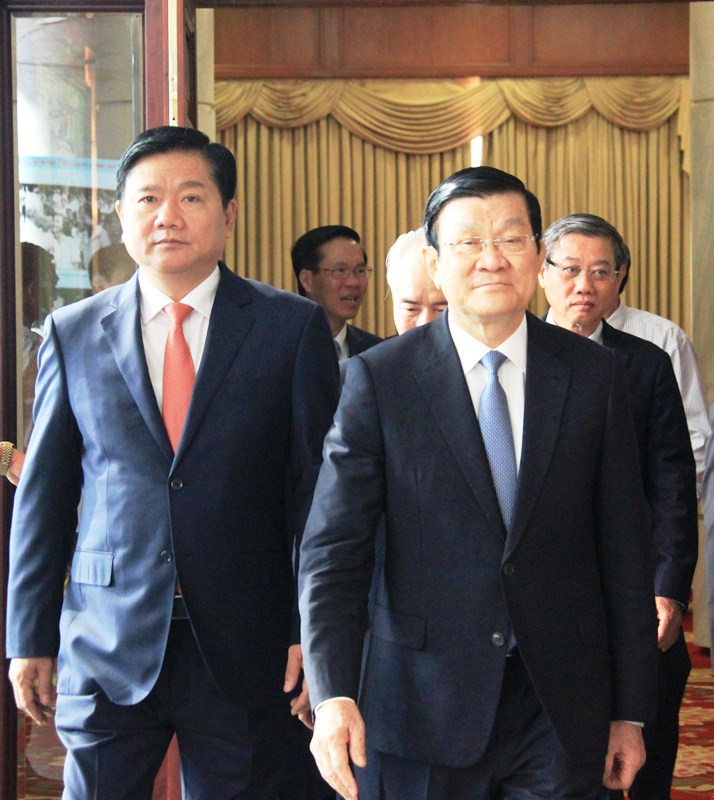 Bí thư Thành ủy TP.HCM Đinh La Thăng cùng nguyên Chủ tịch nước Trương Tấn Sang tại buổi lễ. Ảnh: TÁ LÂM
