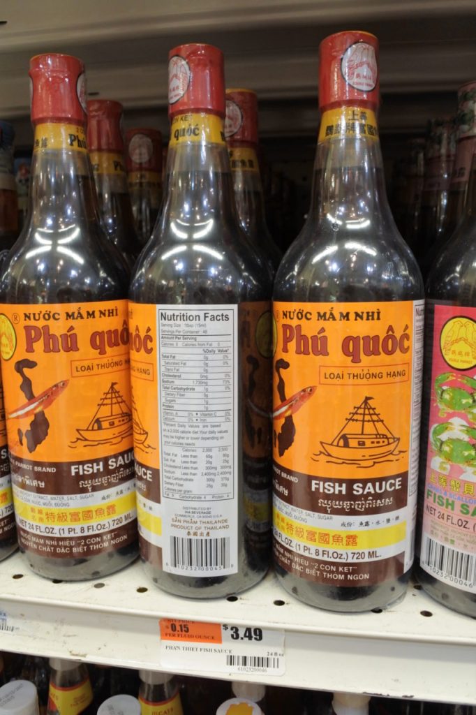 Tôi tìm đỏ mắt mới thấy một chai nước mắm “made in Vũng Tàu, Việt Nam” là Mắm Việt Hải Yến với giá hơn 4 Mỹ Kim nhưng than ôi, đọc kỹ thành phần hoá ra cũng chỉ là một loại “nước chấm”! Không hiểu các nhãn hiệu nước mắm truyền thống sản xuất tại Việt Nam đi đâu hết mà không thấy xuất hiện ở đây?