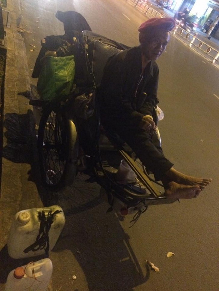 Năm 2017, Chú Nguyễn Vinh Huê, sinh năm 1952, từng là lính dù. Số quân: 72119058. Cha mẹ mất từ nhỏ, chú không có người thân, vô gia cư. Nghề nghiệp: đạp xích lô. Chỗ ở / ngủ / ăn /: trên xe xích lô. Hai bình nhựa đựng nước để nấu trà uống. Bếp ga mini để trên xe xích lô.