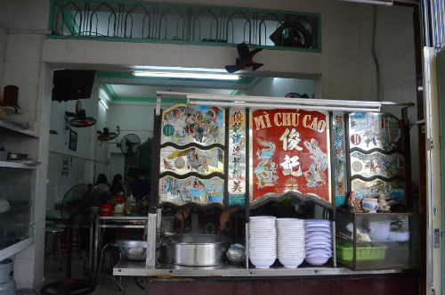 Nằm ngay mặt tiền đường Trần Bình Trọng (quận 5), tiệm mì chú Cao mở cửa đến nay ngót nghét cũng hơn 40 năm. Theo lời con gái của chú Cao, từ hồi mới mở đến giờ tiệm chỉ bán đúng một chỗ.