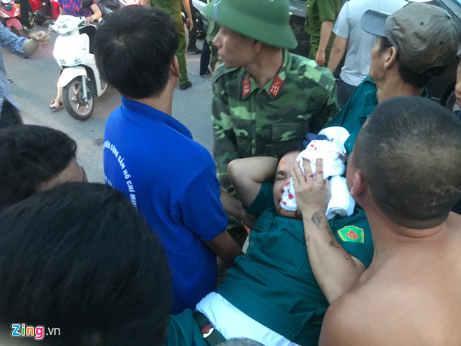 Một người dân bị kính từ đám cháy tầng 18 rơi vào đầu phải đưa lên xe cấp cứu. Ảnh: Trần Anh.
