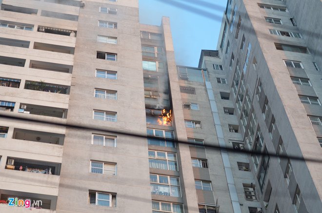 18h20, ngọn lửa bất ngờ bùng phát, lan lên tầng 19 của tòa nhà. Ảnh: Trần Anh.