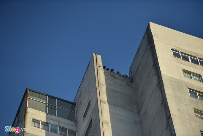Cư dân chạy lên tầng thượng, thò đầu ra khỏi cửa sổ cầu cứu. Ở bên dưới, các tấm kính lớn từ trên tầng cao rơi xuống khiến người dân hoảng loạn. Ảnh: Việt Linh.
