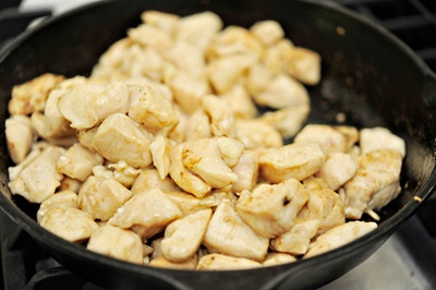 Cho 2 thìa dầu ăn vào chảo, cho thịt gà vào xào khoảng 2 phút.