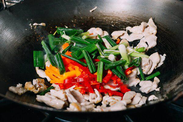 Rồi cho ớt chuông cùng hành hoa vào đảo đều khoảng 3 phút.