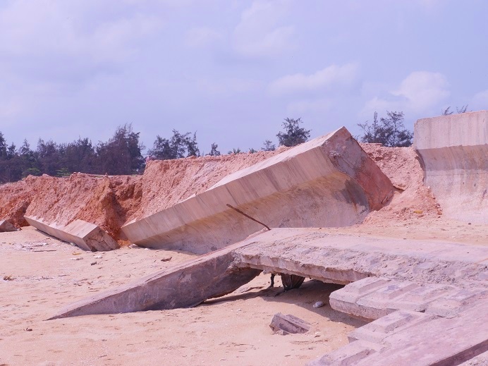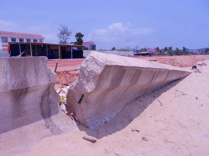 Lai bi mối-Bê tông đục nửa rồi. Nhìn nơi bị gảy như họ đổ vôi bột trôn vào làm bờ kè và hầu như không có đan sắt ở trong.