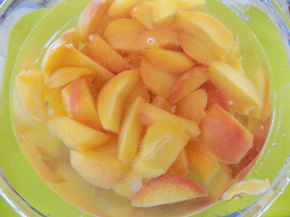 Bước 3: Cắt từng miếng đào cho vào nước lạnh có pha muối, rồi rửa sạch cho ra rổ.