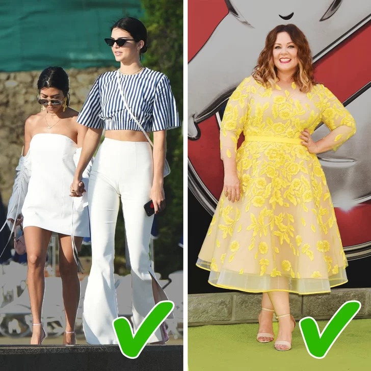 Bạn không cần phải chạy theo các xu hướng thời trang, quan trọng nhất là tìm được những trang phục khắc phục được những khiếm khuyết và tôn lên những ưu điểm của cơ thể. Ví dụ nếu bạn nhỏ, không nên mặc quần áo maxi quá khổ. Nếu bụng hơi to, bạn có thể mặc váy xòe che bớt bụng.