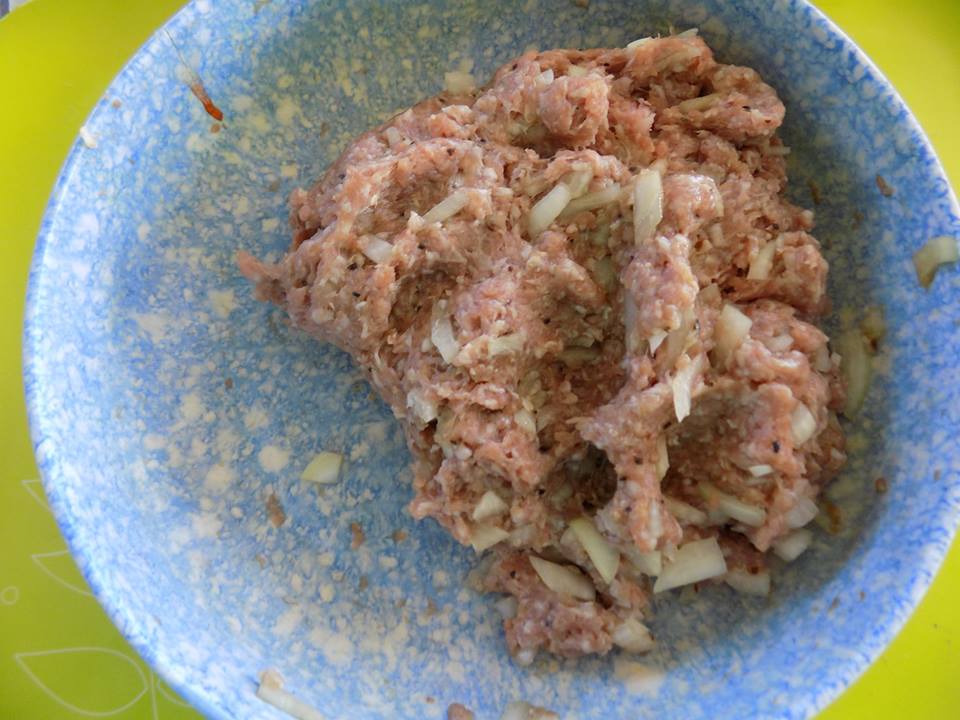 Bước 2: Thịt xay + hành tây cùng các gia vị cho vào âu trộn đều.