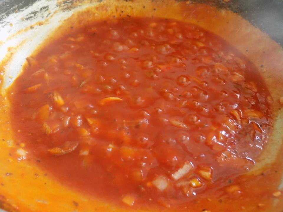 Bước 5: Bắc một cái chảo khác lên bếp, cho vào 1 muỗng canh dầu, chờ dầu nóng cho hành và tỏi vào xào thơm, sau đó cho hết cà chua + sốt cà chua + các gia vị còn lại và nước vào nấu cho cà chua nhừ.