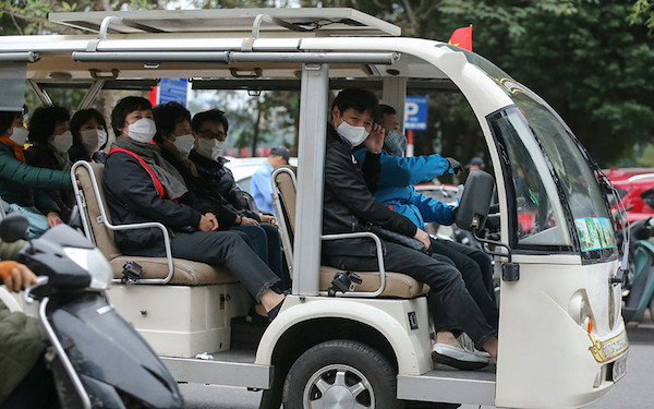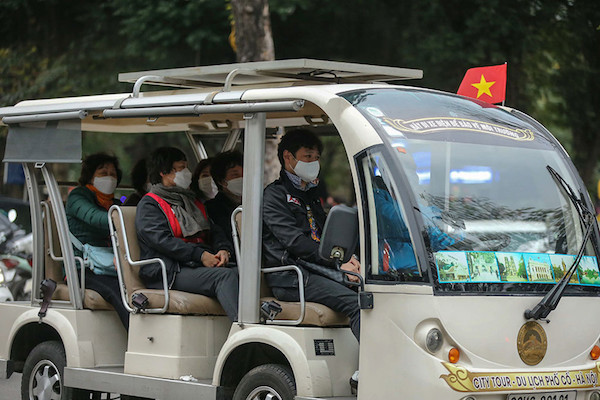 Một tài xế xe điện tại hồ Hoàn Kiếm chia sẻ, du khách đến Việt Nam thời điểm này hầu như đều trang bị khẩu trang y tế đề phòng ngừa dịch. "Chúng tôi cũng được khuyến cáo phải đeo khẩu trang y tế để đảm bảo cho sức khỏe của mình", người này thông tin