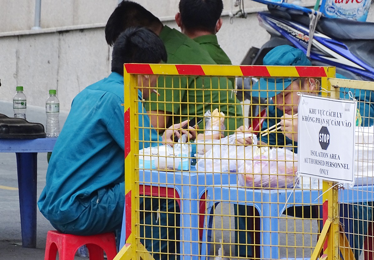 Lực lượng chức năng ăn trưa tại chốt trực trước cổng chung cư Masteri Thảo Điền. Ảnh: Hà An.