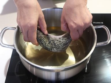 Cá làm sạch vẩy, khía một vài đường chéo ở 2 bên để gia vị ngấm dễ dàng hơn.