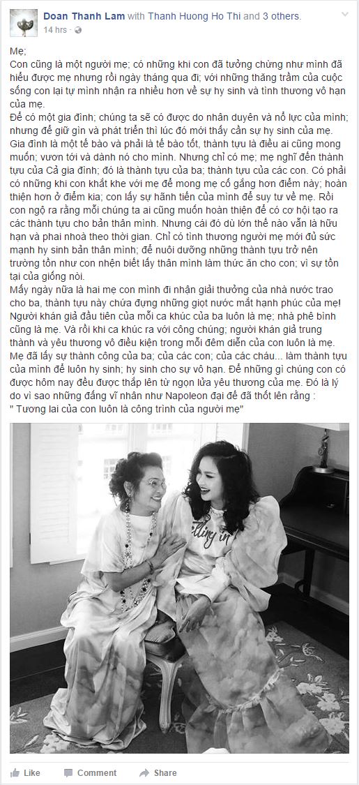 Mấy ngày nữa là hai mẹ con mình đi nhận giải thưởng của nhà nước trao cho ba, thành tựu này chứa đựng những giọt nước mắt hạnh phúc của mẹ! Người khán giả đầu tiên của mỗi ca khúc của ba luôn là mẹ; nhà phê bình cũng là mẹ.