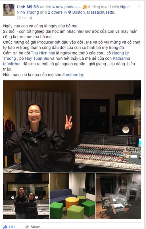 Trong Ngày của mẹ, ca sĩ Mỹ Linh bất ngờ đăng tải một món quà vô giá mà cô con gái lớn Anna đã tặng cho mẹ mình. Theo đó, Anna đã tốt nghiệp đại học âm nhạc như mơ ước của mình và cũng chính là niềm mong mỏi của Mỹ Linh và nhạc sĩ Anh Quân. Cô cũng hạnh phúc cho biết rằng trong ngày hôm nay, Anna chính là món quà vô giá của mình.