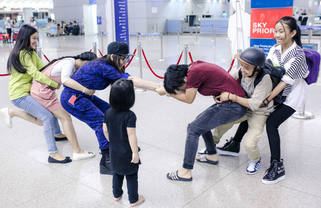 Trong lúc làm thủ tục, Phi Nhung thoải mái vui đùa, chơi trò kéo co cùng các con nuôi tại sân bay khiến nhiều hành khách thích thú.