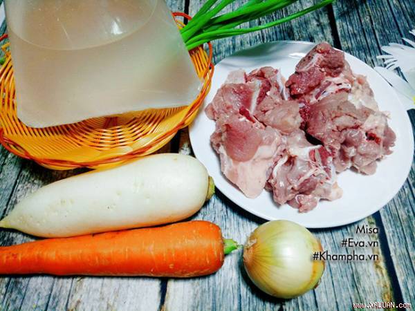 Bước 3:Khi nấu xương heo được khoảng 30 phút, tiếp tục cho cà rốt, củ cải, hành tây, hành tím rồi cho vào nồi nước hầm xương heo (nước dùng) cùng với đường phèn, tiếp tục nấu trong khoảng 1 giờ trên lửa vừa.