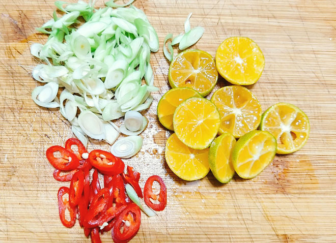 - Bước 2: Quất đem cắt làm 3 và bỏ hết hạt, ớt thái miếng vát mỏng, sả bào mỏng.