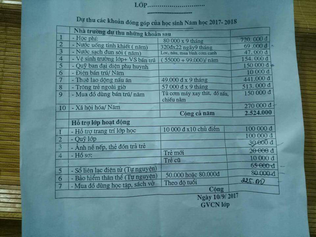 Theo tìm hiểu của Tuổi Trẻ Online, đầu năm học 2017-2018, trường này đưa ra 17 khoản dự thu gồm: học phí 80.000 đồng/tháng (học sinh bán trú); nước uống tinh khiết 69.000 đồng/năm học/cháu, nước sạch đun sôi 47.000 đồng/năm học; vệ sinh trường lớp, vệ sinh bán trú 154.000 đồng/năm, quỹ ban đại diện cha mẹ học sinh 150.000 đồng, xã hội hóa 270.000 đồng/năm/cháu...
