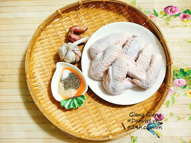 - Bước 1: Cánh gà mua vể rửa sạch sẽ cho hết mùi hôi, để cho ráo nước sau đó chặt cánh gà làm 3 đoạn. Hành tím+tỏi băm nhỏ.