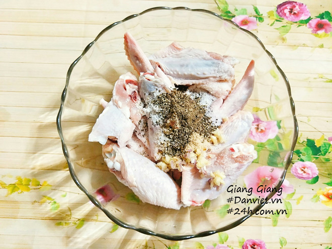 - Bước 2: Cho cánh gà vào tô, thêm hành tím, tỏi băm và các gia vị còn lại. Trộn đều rồi ướp cánh gà ít nhất 1 tiếng cho ngấm gia vị, hoặc bọc kín rồi để ngăn mát tủ lạnh qua đêm, như vậy cánh gà sẽ càng ngon hơn.