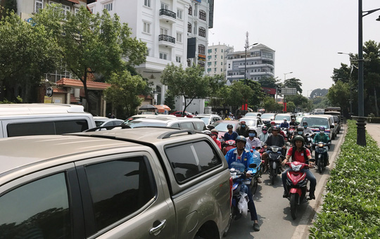 Trong khi dòng xe máy phải kèn cựa từng chút không gian, len lỏi trong khoảng hở giữa dòng ô tô, đi chậm chạp