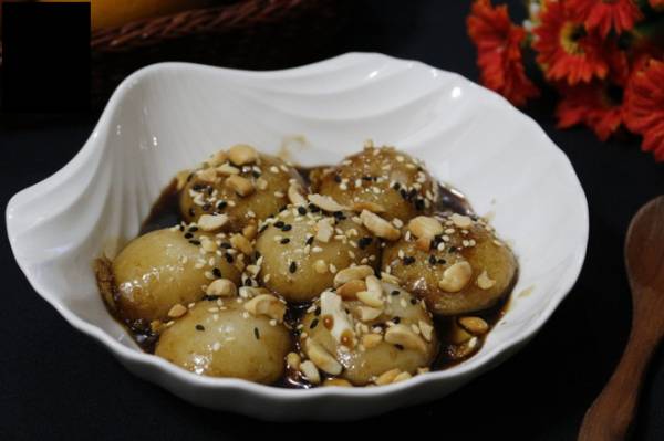 Múc bánh chay ra đĩa rồi rắc vừng trắng và đen lên trên, thêm lạc giã dập là món bánh chay rim đường đã hoàn thành.
