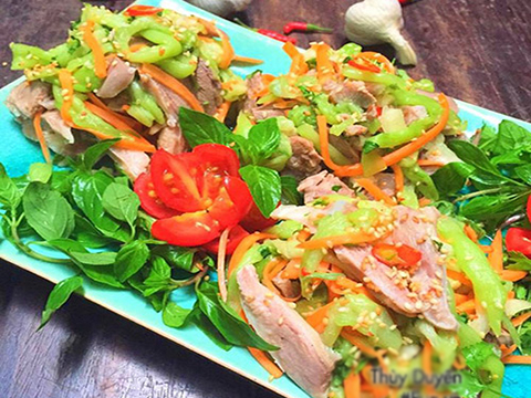 - Sau đó cho phẫn lưỡi heo đã ướp riêng từ trước vào trộn đều cùng dọc mùng và cà rốt, cuối cùng cho thêm rau thơm mùi thái nhỏ vào. Nêm nếm lại món nộm cho vừa vị đảm bảo độ chua ngọt vừa ăn.