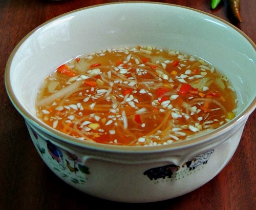 Bước 2: Tiến hành pha nước mắm chua ngọt. Bước này rất quan trọng vì nó quyết định đến vị của món ăn. Bạn không được để nước chua quá, hoặc ngọt quá. Bạn hãy cho 1 thìa canh nước mắm + 1 thìa đường+ 1 quả chanh + 2 thìa canh đường cùng với ớt đã thái nhỏ. Trộn đều hỗn hợp trên đến khi đường tan hết.