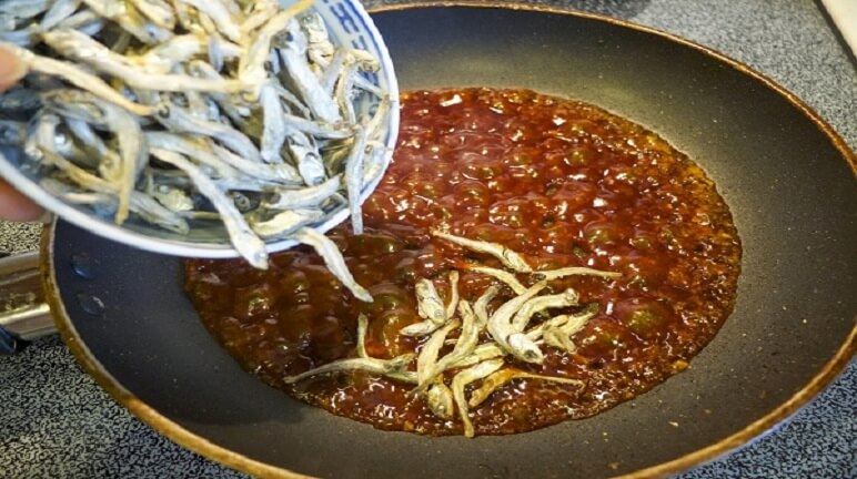 Hành khô bóc vỏ, đập dập và phi cho thật vàng rồi cho cá khô vào đảo đều. Lúc này bạn chỉ để lửa vừa thôi nhé, đừng để lửa to cá cơm khô sẽ bị cháy. Khi bạn thấy cá se khô và dậy mùi thơm thì bạn hãy đổ nước mắm chua ngọt đã pha ở trên vào đảo đều tay, cho lửa nhỏ để cá được ngấm. Đun đến khi bạn thấy nước cạn và keo lại, ngấm đều vào cá thì tắt bếp.