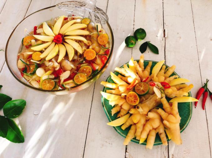 - Sả 3-5 tép cắt lát mỏng, ớt cắt nhỏ, gừng 1 củ nhỏ cắt sợi, tỏi 1 củ nhỏ cắt lát mỏng, 2-3 lá chanh cắt nhỏ, tắc 4-5 cắt đôi bỏ hạt. Cho tất cả vào nước ngâm đã để nguội, cho chân gà vào ngâm. Cho vào ngăn mát tủ lạnh 1-2 tiếng sau là ăn được. Thêm xoài non hoặc xoài sống cắt nhỏ ngâm chung.