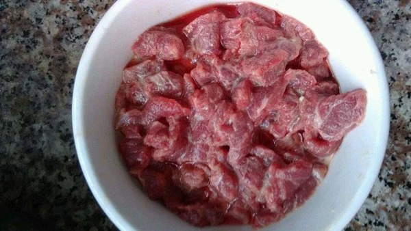 Bước 1: Rửa sạch thịt bò rồi ngâm vào bát nước có pha lẫn vài giọt chanh khoảng 15 phút; mục đích là để loại bỏ những phần máu còn đọng lại trên thịt.