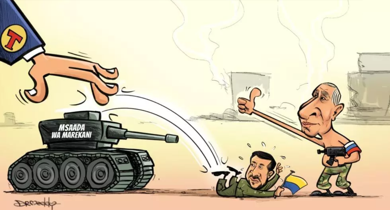 Biếm họa về tình trạng bất lợi của Ukraina trước quân Nga trong bối cảnh đầu tháng 3/2025, Mỹ đình chỉ toàn bộ viện trợ quân sự cho Kiev, sau cuộc đối thoại căng thẳng giữa Trump và Zelensky tại Nhà Trắng ngày 28/02/2025. © FMM