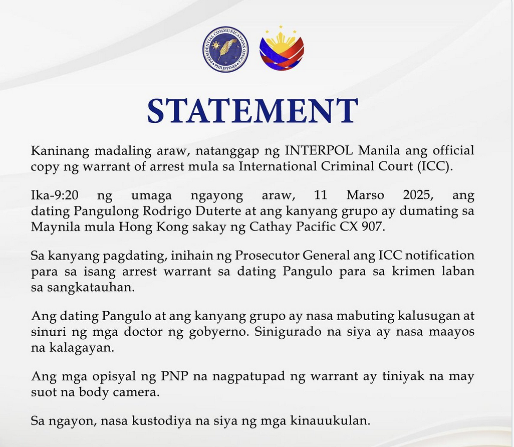 Thông báo của Văn phòng Truyền thông Tổng thống Philippines (PCO về việc bắt giữ cựu Tổng thống nước này, ông Rodrigo Duterte. Ảnh: ABS-CBN News/X