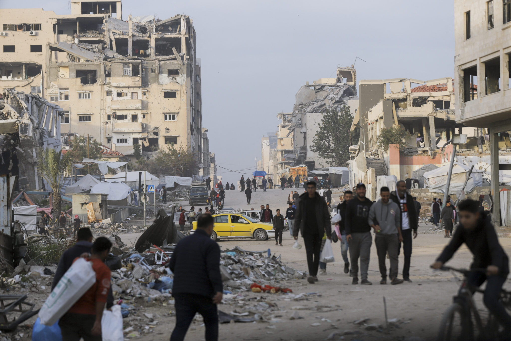 Cư dân đi dọc con đường đầy bụi đất gần những tòa nhà bị sập ở Gaza City hôm Thứ Ba, 25 tháng Ba. (Ảnh: Saeed Jaras/Middle East Images/AFP via Getty Images)